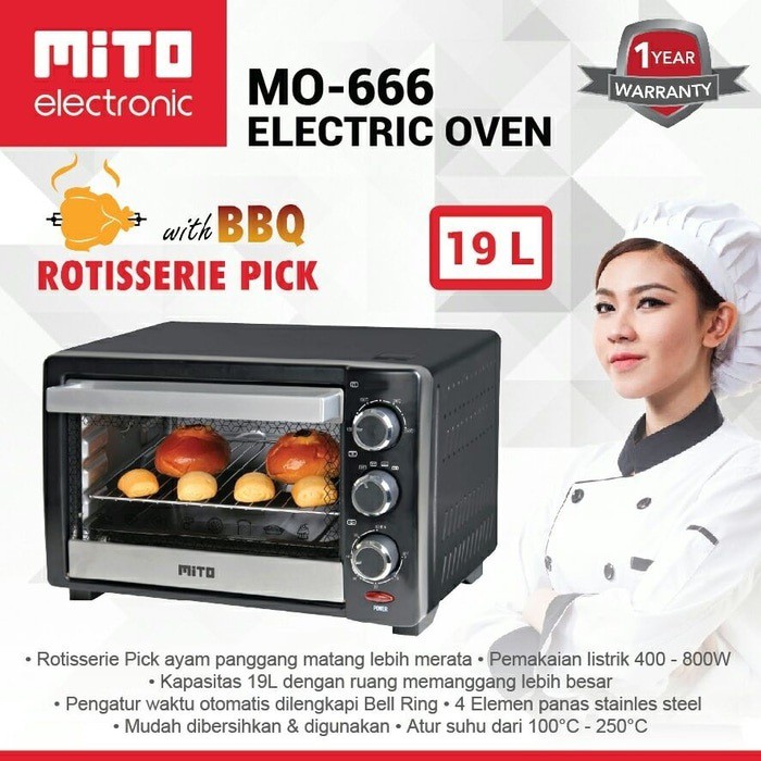 Jual oven listrik mito neo mo 666 kapasitas 20 l dengan lampu terlengkap dengan kualitas terbaik. Dilengkapi dengan rotisserie pick untuk memanggang seekor ayam utuh. Harga mito mo 666 oven listrik hitam 19 l terbaru mei 2020 cicilan 0 gratis ongkir 100 original pembayaran aman mudah. Oven listrik mito mo 888 kapasitas 33 liter full body stainless steel.