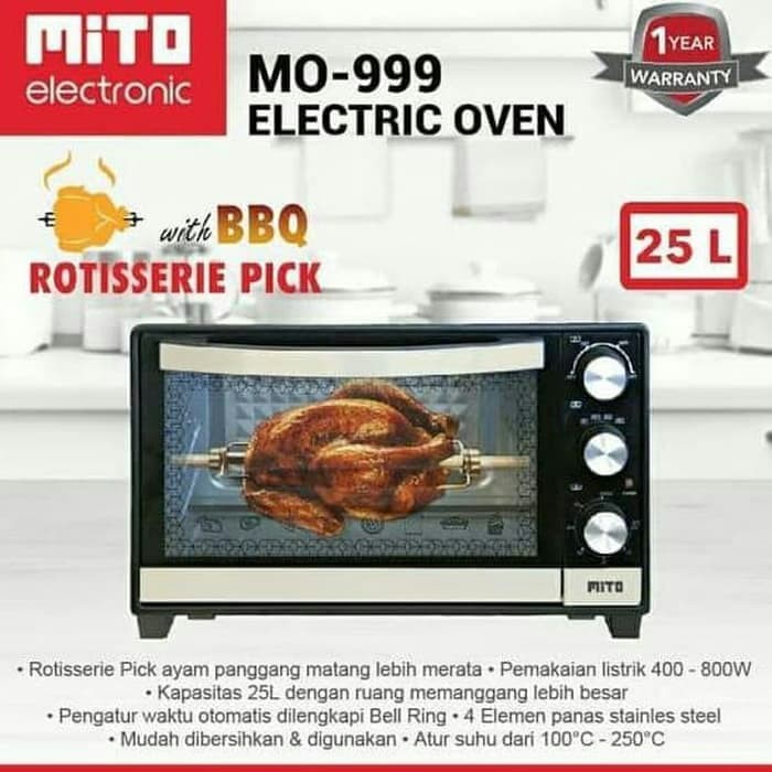 Harga mito mo 999 oven listrik hitam 25 l terbaru juli 2020 cicilan 0 gratis ongkir 100 original pembayaran aman mudah. Pengiriman cepat pembayaran 100 aman. Terdapat 4 elemen pemanas dari stainless steel serta pengatur waktu otomatis dilengkapi dengan bell ring. Mito mo 999 mo999 rotiserrie grill pemanggang oven listrik 25 l.