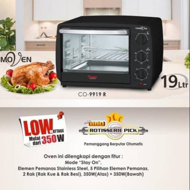Microwave oven cosmos co 9919 membutuhkan daya sekitar 400 800 w untuk beroperasi maksimal. Bonus dapat berubah setiap saat. Cosmos co 9919 r oven 19 l. Oven listrik untuk rumah tangga merk cosmos co 9919 r bbq rotiserrie pick elemen pemanas stainless steel mudah dibersihkan dan digunakan 6 pilihan elemen panas 2 rak rak kue rak besi.